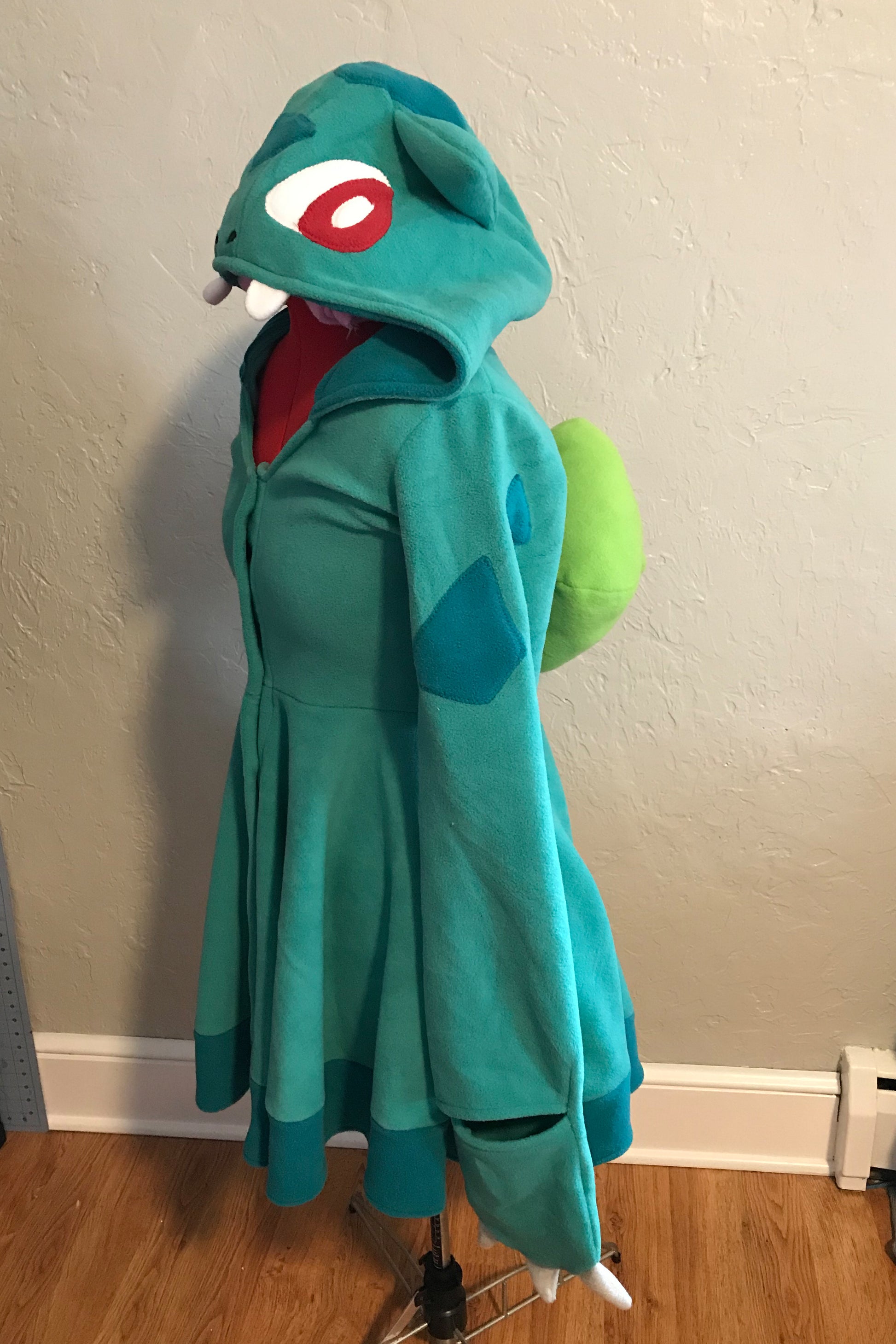 Cosplay in comfort with our fleece Bulbasaur inspired kigurumi dress! This handcrafted Pokemon dress is perfect for a casual cosplay, geeky parties and events, or for snuggling up at home. The bulb is removable with velcro attachments, so you can still sit comfortably or wear backpacks.