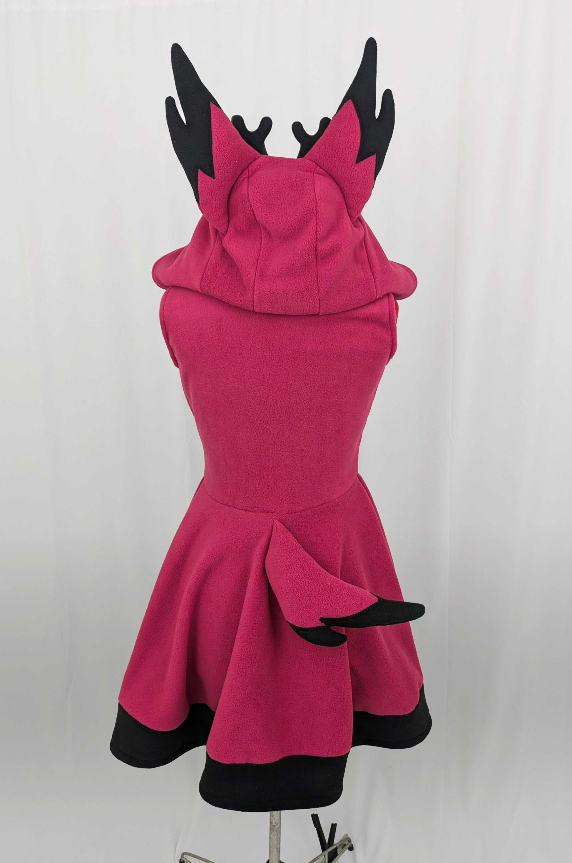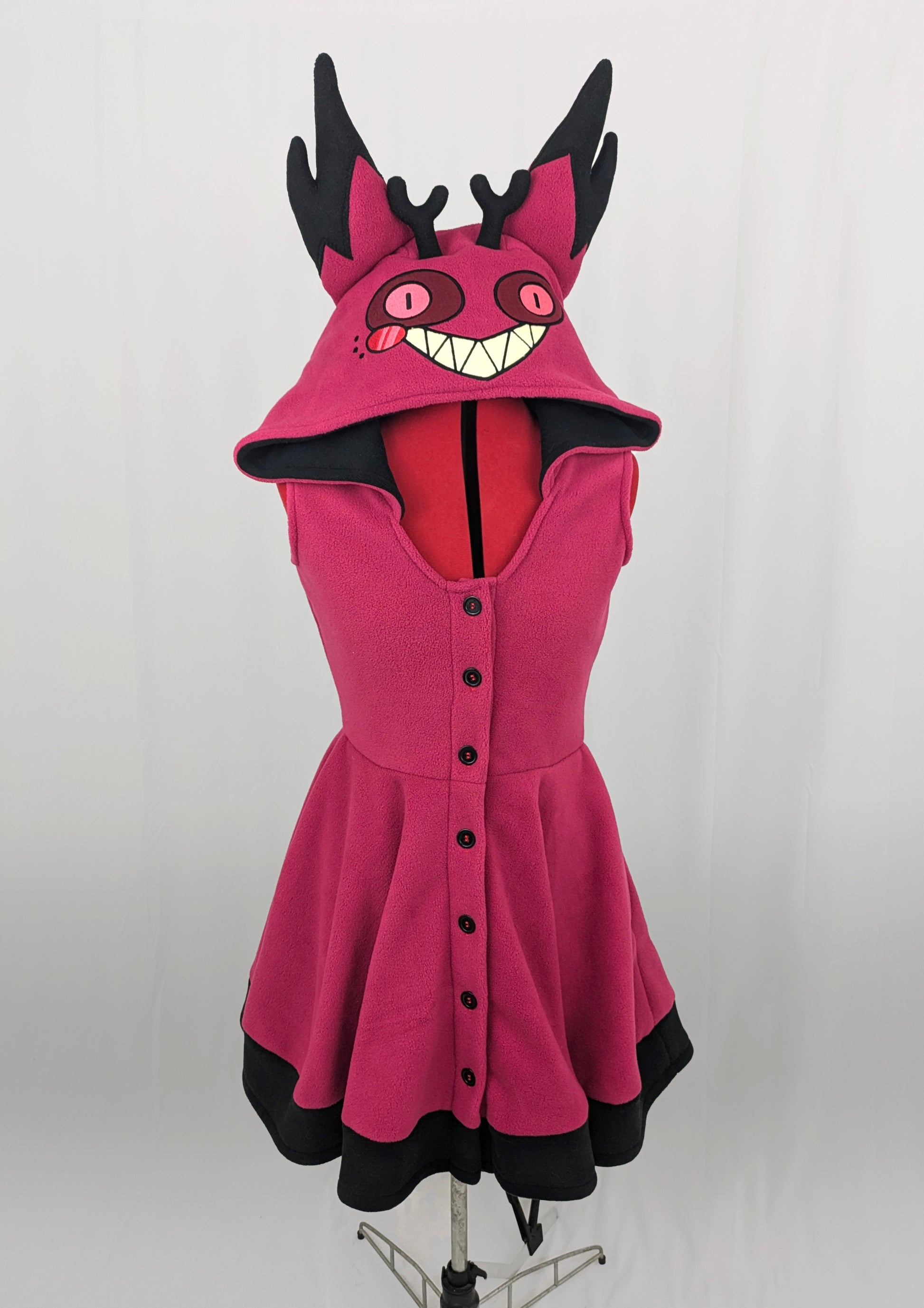 Cosplay in comfort with this cursed cat dress, inspired by Alastor from Hazbin Hotel! This handmade dress is perfect for a casual cosplay, geeky conventions and parties, or for snuggling up at home. The Cursed Cat Alastor dress can be made to your measurements, and custom sizing is free!