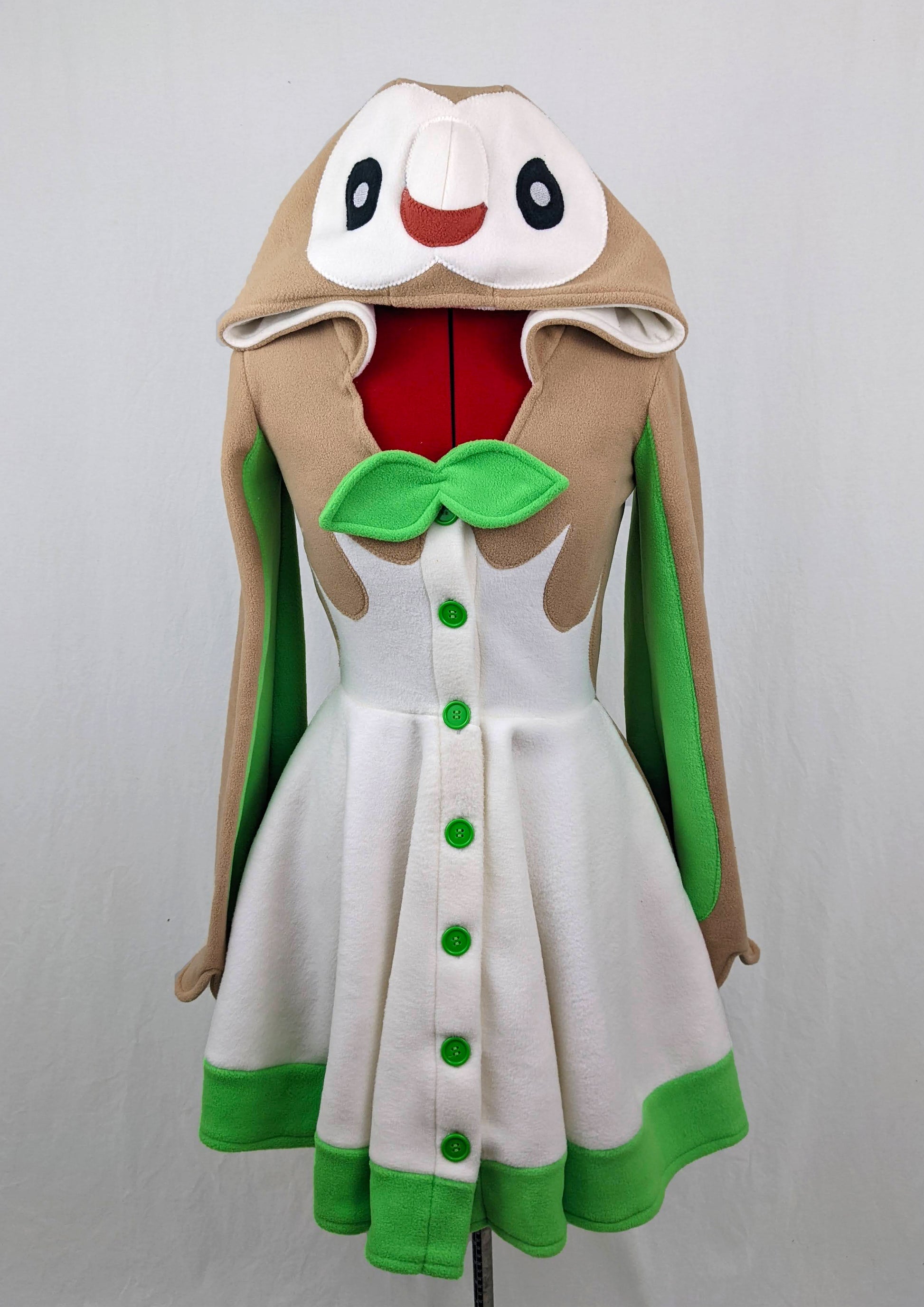 Cosplay in comfort in this adorable fleece dress inspired by one of our favorite starter pokemon, Rowlet! You can choose to order one sleeveless, with short sleeves, or with the "wing" bell sleeve. (pictured here) This handmade dress is perfect for a casual cosplay, geeky conventions, Halloween parties, or for pajamas at home.