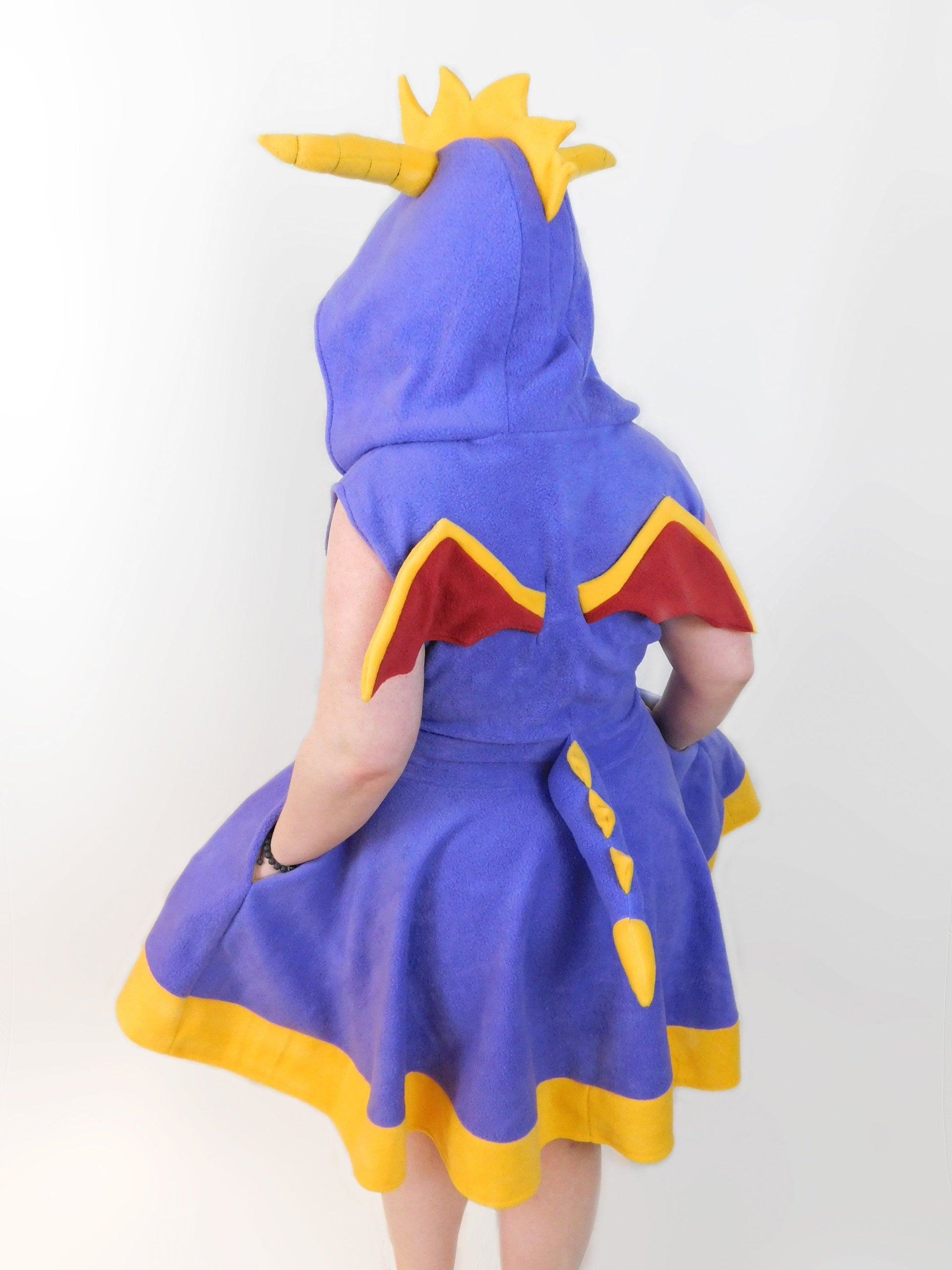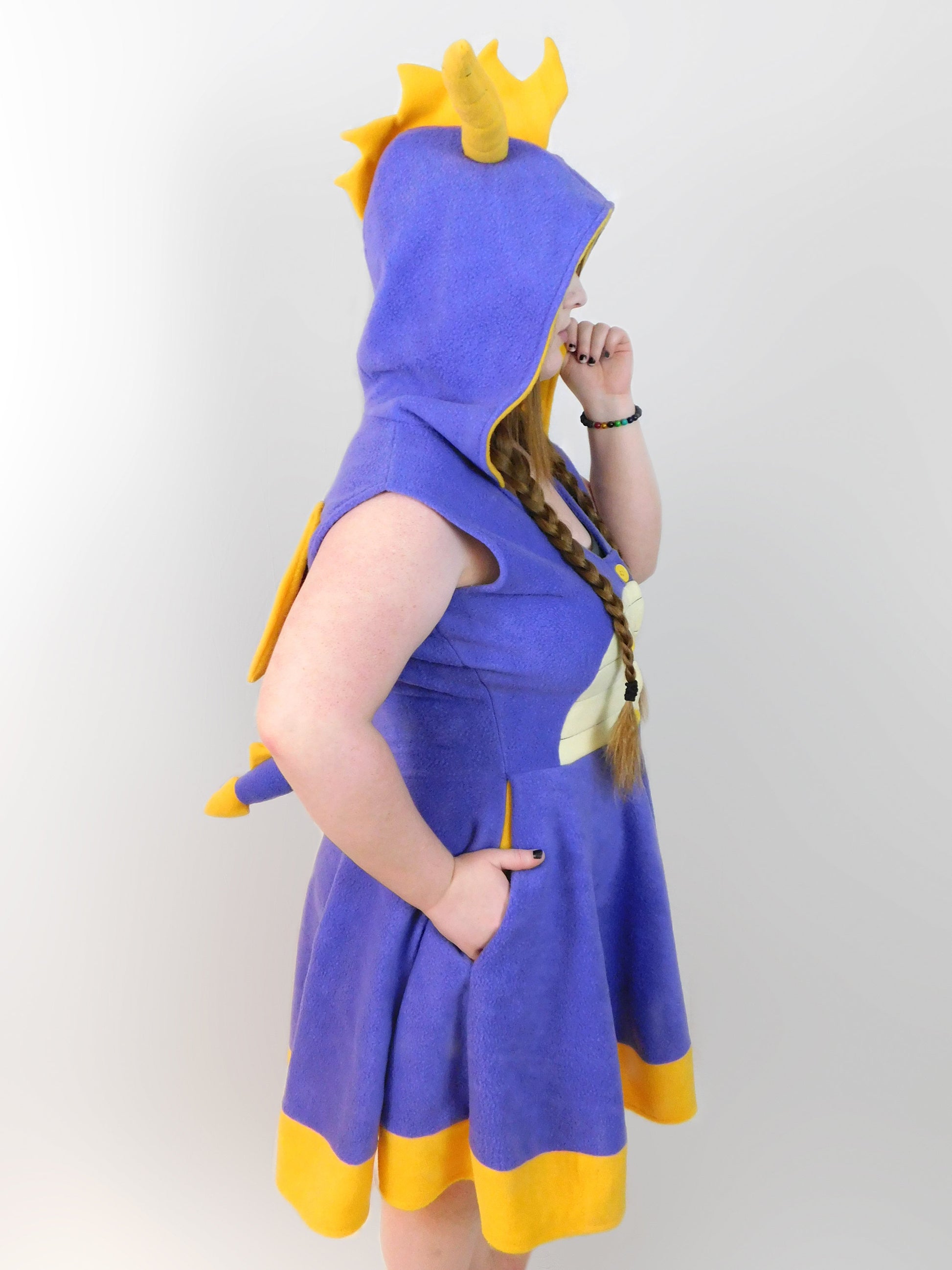 Snuggle up to play some retro Spyro games with this super comfy purple dragon dress! It comes with yellow pockets, and a little tail. This handmade dress is perfect for a casual cosplay, geeky conventions, Halloween parties, or for pajamas at home.